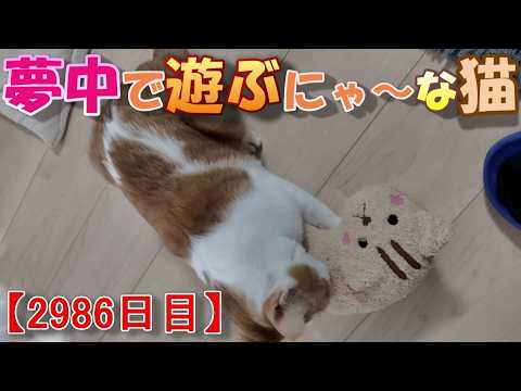 2986日目です。ニケが顎のせ枕で遊んでます。